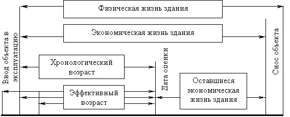 Определение износа оцениваемого здания Износ – это уменьшение стоимости объекта недвижимости, обусловленное различными причинами. Износ обычно измеряют в процентах, а стоимостным выражением износа является обесценение. Накопленный (совокупный) износ объекта оценки – совокупность всех возможных видов износа, который характеризуется уменьшением полезности объекта недвижимости, его потребительской привлекательности с точки зрения потенциального инвестора и выражается в снижении со временем стоимости (обесценении) под воздействием различных факторов. По мере эксплуатации объекта постепенно ухудшаются параметры, характеризующие конструктивную надежность зданий и сооружений, а также их функциональное соответствие текущему и тем более будущему использованию, связанные с жизнедеятельностью человека. Кроме того, на стоимость недвижимости в не меньшей степени оказывают влияние и внешние факторы, обусловленные изменением рыночной среды, наложением ограничений на определенное использование зданий и т.д. Износ в оценочной практике необходимо отличать по смыслу от подобного термина, используемого в бухгалтерском учете (начисление износа). Оценочный износ – один из основных параметров, позволяющих рассчитать текущую стоимость объекта оценки на конкретную дату. Таким образом, учет износа объекта – это своего рода корректировка стоимости вновь воспроизведенного здания (воспроизведенного с помощью затратного подхода) для того, чтобы определить стоимость оцениваемого объекта. Совокупный накопленный износ является функцией времени жизни объекта. Рассмотрим основные оценочные понятия, характеризующие этот показатель (рис. 3). Рис. 3 Периоды жизни здания и характеризующие их оценочные показатели Физическая жизнь здания (ФЖ) – период эксплуатации здания, в течение которого состояние несущих конструктивных элементов здания соответствует определенным критериям (конструктивная надежность, физическая долговечность и т.п.). Срок физической жизни объекта закладывается при строительстве и зависит от группы капитальности зданий. Физическая жизнь заканчивается, когда объект сносится. Хронологический возраст (ХВ) – период времени, прошедший со дня ввода объекта в эксплуатацию до даты оценки. Экономическая жизнь (ЭЖ) – время эксплуатации, в течение которого объект приносит доход. В этот период проводимые улучшения вносят вклад в стоимость объекта. Экономическая жизнь объекта заканчивается, когда эксплуатация объекта не может принести доход, обозначенный соответствующей ставкой по сопоставимым объектам в данном сегменте рынка недвижимости. При этом проводимые улучшения уже не вносят вклад в стоимость объекта вследствие его общего износа. Эффективный возраст (ЭВ) рассчитывается на основе хронологического возраста здания с учетом его технического состояния и сложившихся на дату оценки экономических факторов, влияющих на стоимость оцениваемого объекта. В зависимости от особенностей эксплуатации здания эффективный возраст может отличаться от хронологического возраста в большую или меньшую сторону. В случае нормальной (типичной) эксплуатации здания эффективный возраст, как правило, равен хронологическому. Оставшийся срок экономической жизни (ОСЭЖ) здания – период времени от даты оценки до окончания его экономич